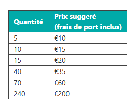 Notez qu’à l’heure actuelle les commandes sont limitées à quelques quantités spécifiques comme indiqué dans le tableau ci-dessous. Si vous souhaitez commander un montant différent, veuillez nous contactez pour voir comment nous pouvons vous aider.